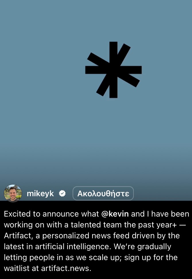 Οι ιδρυτές του Instagram, Kevin Systrom και ο Mike Krieger ανακοίνωσαν το λανσάρισμα του Artifact, μιας εφαρμογής που υπόσχεται «μια εξατομικευμένη ροή ειδήσεων» που τροφοδοτείται από τεχνητή νοημοσύνη.